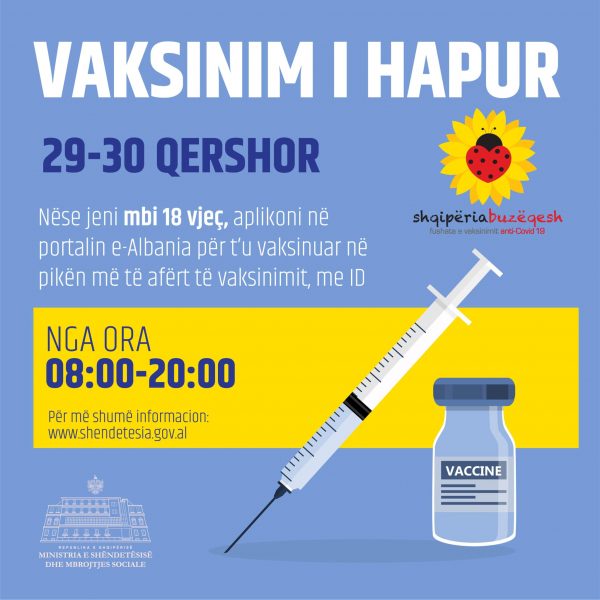 Ditët e hapura të vaksinimit do të jenë në datat 29 dhe 30 Qershor në pikat e meposhtme të vaksinimit në të gjithë vendin nga ora 08:00 në 20:00.