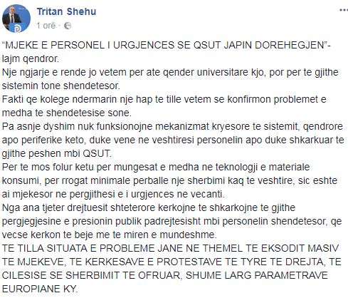 Dorëhqeja kolektive e mjekëve në pavionin e Urgjencës së QSUT-së ka sjellë një reagim të ashpër nga Partia Demokratike, që e lidh ngjarjen me problemet e mëdha të këtij sistemi. Deputeti dhe ish-ministri i Shëndetësisë, Tritan Shehu shkruan në rrjetet sociale se kemi të bëjmë me një ngjarje të rëndë për shëndetësinë shqiptare, e cila realisht gjendet përballë një eksodi tërësisht të justfikiueshëm.