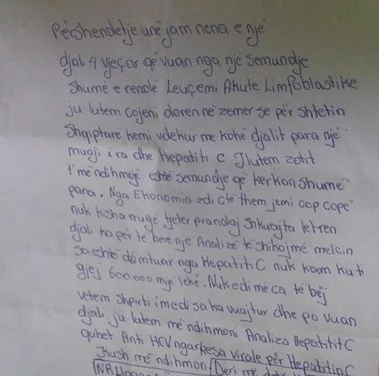“Përshëndetje unë jam nëna e një djali 4 vjeçar që vuan nga një sëmundje shumë e rëndë, Leuçemi Akute Limfoblastike. Për shtetin shqiptar kemi vdekur me kohë. Djalit para një muaji i ra dhe hepatiti C. I lutem zotit të më ndihmojë, është sëmundje që kërkon shumë para. Nga ana ekonomike s’di çtë them jemi cop copë, nuk kisha rrugë tjetër prandaj shkrujta letrën. Djali ka për të bërë një analizë të shikojmë mëlçinë sa është dëmtuar nga Hepatiti C nuk kam ku t’i gjej 600 000 mijë lekë. Nuk e di me ca të bëj vetëm shpirti i im e di sa ka vuajtur dhe po vuan djali. Ju lutem më ndihmoni analiza e hepatitit C quhet Anti HCV ngarkesa virale për Hepatitin C”.