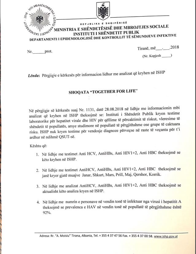 Pasi ka marrë problematikën gazeta Shëndeti bazuar në Ligjin nr. 119/2014 “Për të drejtën e informimit” ka paraqitur kërkesë për informim për autoritetin publik, Instituti i Shëndetit Publik , me anë të së cilës kërkoi informacion në lidhje me kryerjen ose jo të analiza AntiHCV, Anti HBS, Anti HIV 1+2, Anti HBC.