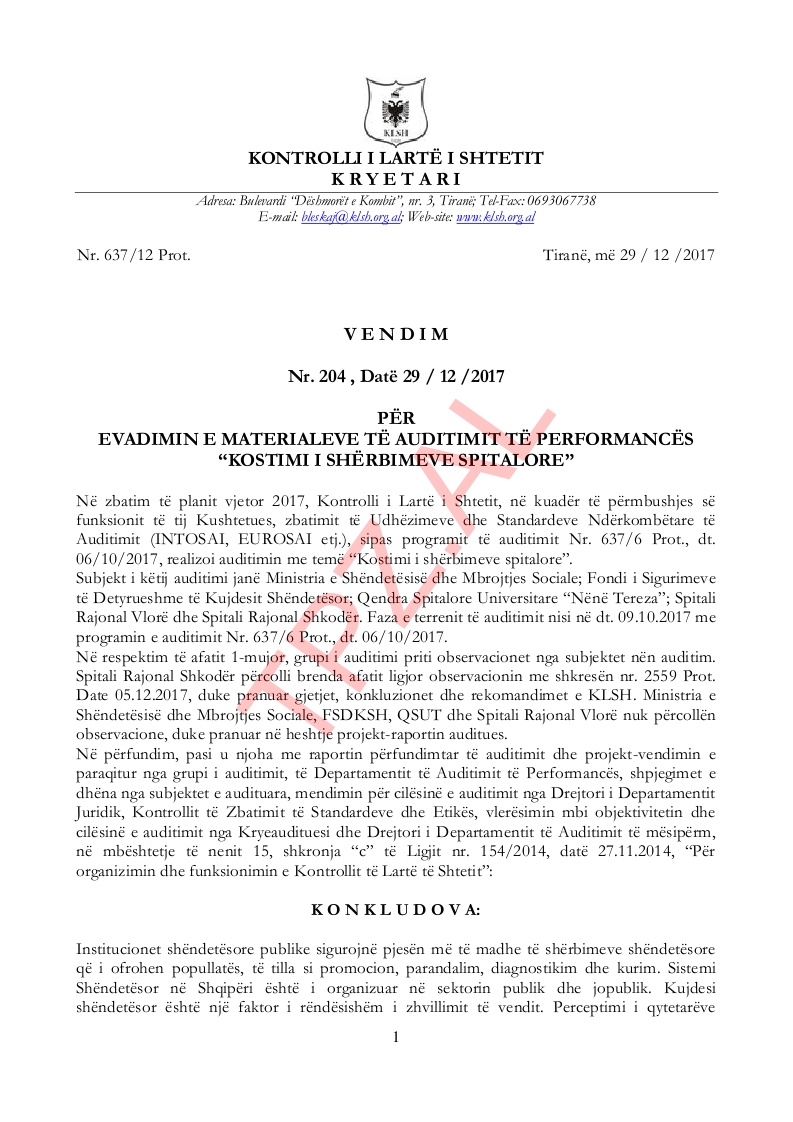“Mungesa e specialiteteve pranë shërbimeve në spitalet rajonale dhe bashkiake, si dhe mungesa e performancës së shërbimit parësor ka krijuar rritjen e kostove dhe përqendrimin e pacienteve në qendrën më të madhe universitare QSUT. Implementimi i paketave shëndetësore përbën një nismë të mirë për miratimin e protokolleve për këto paketa, por mënyra e vlerësimit financiar të tyre bie ndesh me ligjin e prokurimeve publike, duke rritur kostot e këtyre shërbimeve shëndetësore” – thotë KLSH.