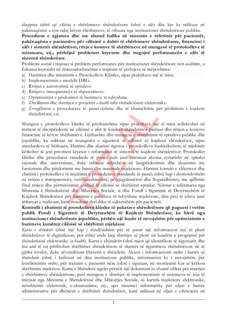 “Protokollet klinike dhe procedurat standarde të punës nuk janë miratuar akoma zyrtarisht në spitalet rajonale dhe universitare, duke ndikuar ndjeshëm në keqpërdorimin dhe abuzimin me furnizimin dhe përdorimin me barna dhe materiale mjekësore. Karta e shëndetit është një hap i rëndësishëm për të patur një informacion më të plotë shëndetësor të digjitalizuar, por është ende larg shtrirjes së plotë në kuadrin e programit për shëndetësisë elektronike (e-health)” – thuhet në raport.