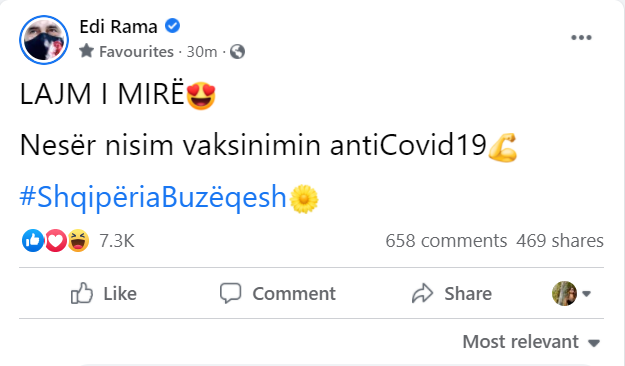 “Nesër nisim vaksinimin antiCovid-19”, shkruan kryeministri Edi Rama në një postim në Facebook.