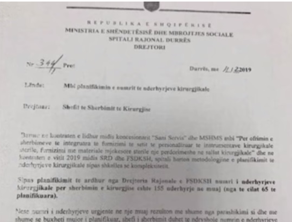 Në spitalin e Durrësit për shembull në një muaj duhet të kryhen 155 ndërhyrje kirurgjikale, 65 prej tyre te planifkuara, por nëse numri i operacioneve urgjente rezulton më shumë se 90 shefi i shërbimit duhet t’i shtyjë ndërhyrjen pacientit që e ka planifikuar. Të paktën kështu thuhet në shkresën që drejtoria i ka dërguar shefit të shërbimit të kirurgjisë në spitalin e Durrësit.