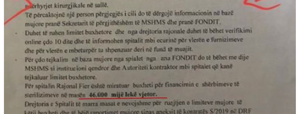 Ndërkohë spitali i Fierit nuk duhet të tejkalojë buxhetin prej 46 mijë lekë në vit për shërbimin e sterilizimit. Drejtori i Fondit të Sigurimit të Detyrueshëm të Kujdesit Shëndetësor i kërkon spitalit rajonal të ruajë limitet buxhetore dhe të planifikojë numrin e ndërhyrjeve kirurgjikale në përputhje me kontratën e lidhur me koncesionarin.