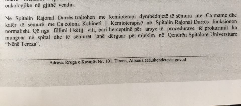 Më një shkresë, të datës 21.05.2018, e pyetur lidhur me ofrimin e kujdesit shëndetësor në shërbimin e Kimioterapisë në spitalin rajonal Durrës, Ministria e Shëndetësisë dhe Mbrojtjes Sociale ka kthyer përgjigje, duke u shprehur si më poshtë: