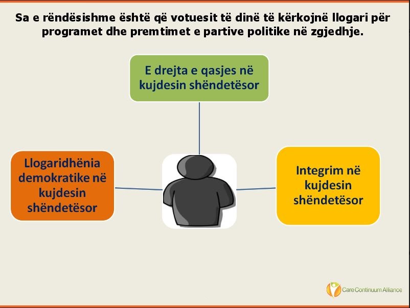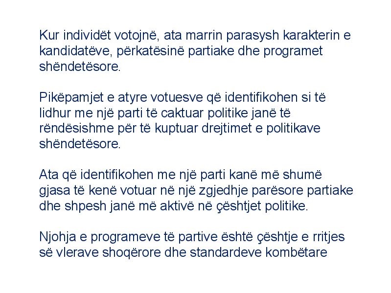 Njohja e programeve të partive është çështje e rritjes së vlerave shoqërore dhe standardeve kombëtare. Kur individët votojnë, ata marrin parasysh karakterin e kandidatëve, përkatësinë partiake dhe programet shëndetësore. Pikëpamjet e atyre votuesve që identifikohen si të lidhur me një parti të caktuar politike janë të rëndësishme për të kuptuar drejtimet e politikave shëndetësore.
