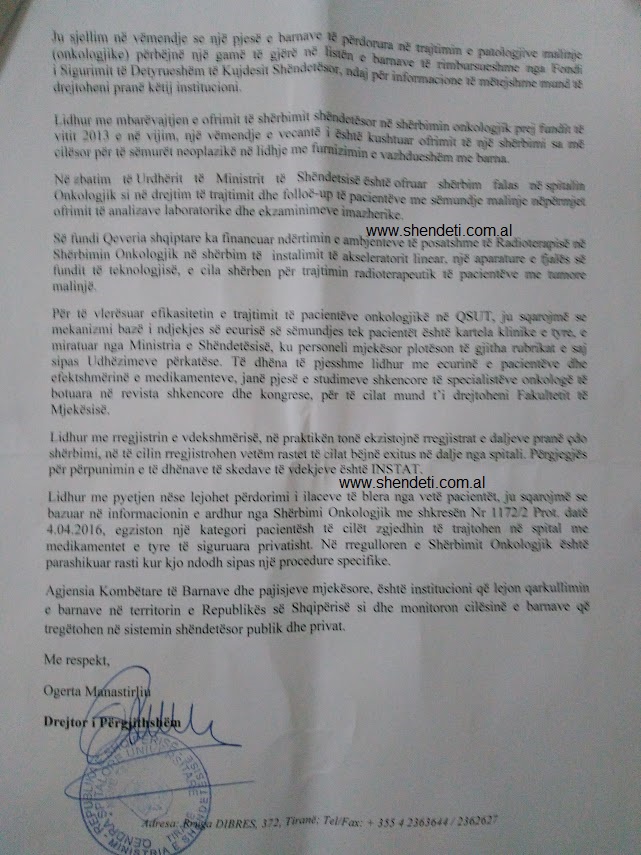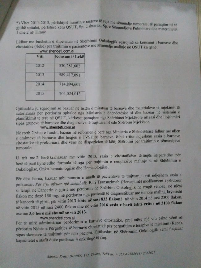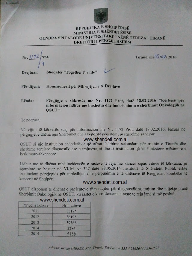 Nisur nga kjo deklaratë, gazeta “Shëndet+” iu drejtua Qendrës Spitalore Universitare “Nënë Tereza” për trajtimin që u bëhet të sëmurëve me kancer, duke kërkuar një informacion të plotë për gjashtë vitet e fundit 2011-2016 lidhur me: numrin e të sëmurëve me kancer, buxhetin e kërkuar nga Spitali Onkologjik, buxhetin e akorduar për këtë spital dhe përgjegjësinë që ky institucion mban për mungesat.