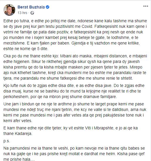 Përmes një postimi në faqen e tij në Facebook, gazetari Berat Buzhala rrëfen se është prekur nga COVID-19, dhe bashkë me të edhe disa familjarë të tij. Një prej familjarëve, i ati akoma nuk ka arritur ta fitojë betejën me COVID-19, ku siç gazetari rrëfen, ka prej 5 ditësh që është në gjendje kome.
